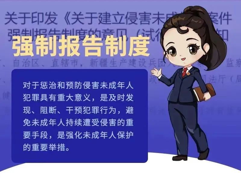 2020年5月,最高人民检察院、国家监察委员会、教育部等九部门联合印发《关于建立侵害未成年人案件强制报告制度的意见(试行)》(以下简称“意见”),2021年6月1日开始实施的新《中华人民共和国未成年人保护法》从法律层面确认了强制报告制度,对加强未成年人的全面综合司法保护,及时有效惩治侵害未成年人违法犯罪起到重要作用。