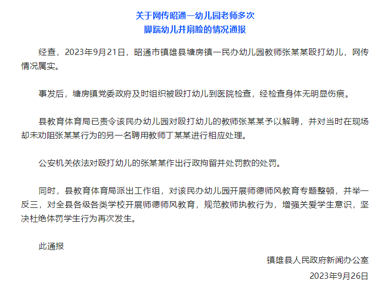 昭通市镇雄县塘房镇一民办幼儿园教师张某某体罚幼儿被解聘