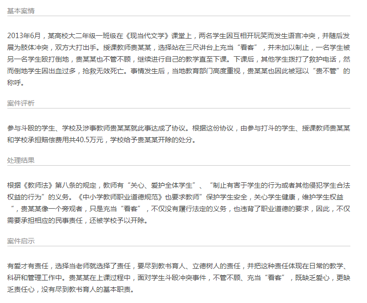 高校教师在课堂斗殴中充当“看客”被开除并承担赔偿责任