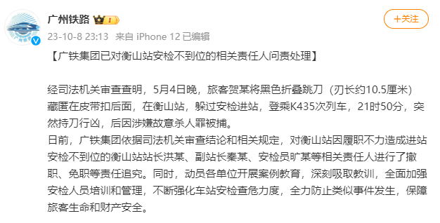 衡山站安检不到位 相关责任人被撤职或免职